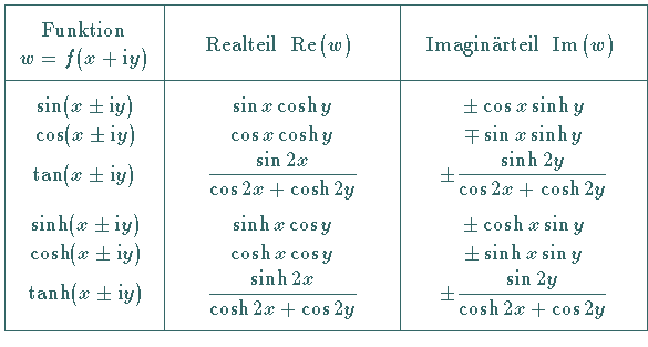 Tabelle Real- und Imaginärteile der trigonometrischen und Hyperbelfunktionen