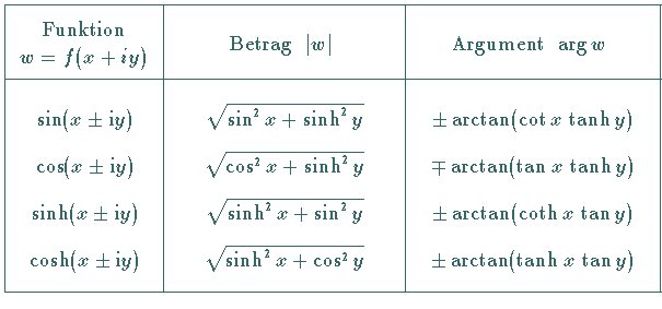 Tabelle Absolutbeträge und Argumente der trigonometrischen und Hyperbelfunktionen