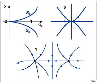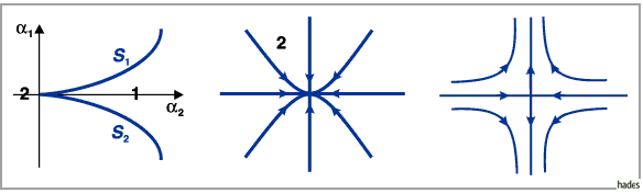 1 in 2 bildet sich eine zweifach zusammengesetzte Ruhelage vom Sattelknoten-Typ, die sich