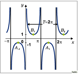 stellt graphisch eine um die Strecke nach rechts verschobene Sekanskurve dar. Die Asymptoten sind . Die Maxima liegen bei mit und die Minima bei mit