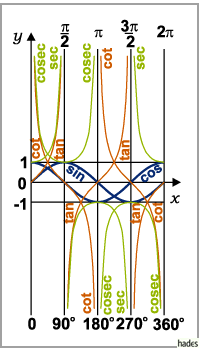 Die sechs trigonometrischen Funktionen sind in der folgenden Abbildung in allen vier