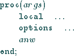 Um in sich abgeschlossene Programme zu gestalten, benutzt man in Maple die Prozeduranweisung. Sie kann sich über viele Zeilen erstrecken, entsprechend abgespeichert und unter ihrem Namen in die laufende Arbeit eingefügt werden. Ihre Grundstruktur lautet