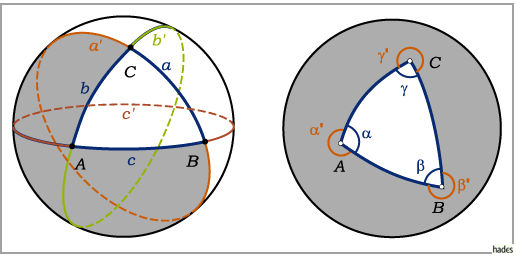Dadurch entstehen mehrere verschiedene sphärische Dreiecke, z.B. auch das sphärische