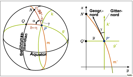 zwischen beiden Nordrichtungen heißt Meridiankonvergenz .