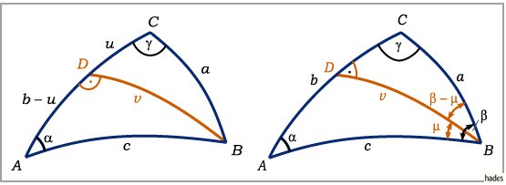 des vorliegenden schiefwinklig sphärischen Dreiecks in zwei rechtwinklig sphärische