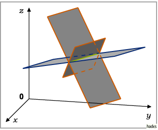 Die folgende Abbildung zeigt den Fall eines Ebenenbüschels mit drei Ebenen.